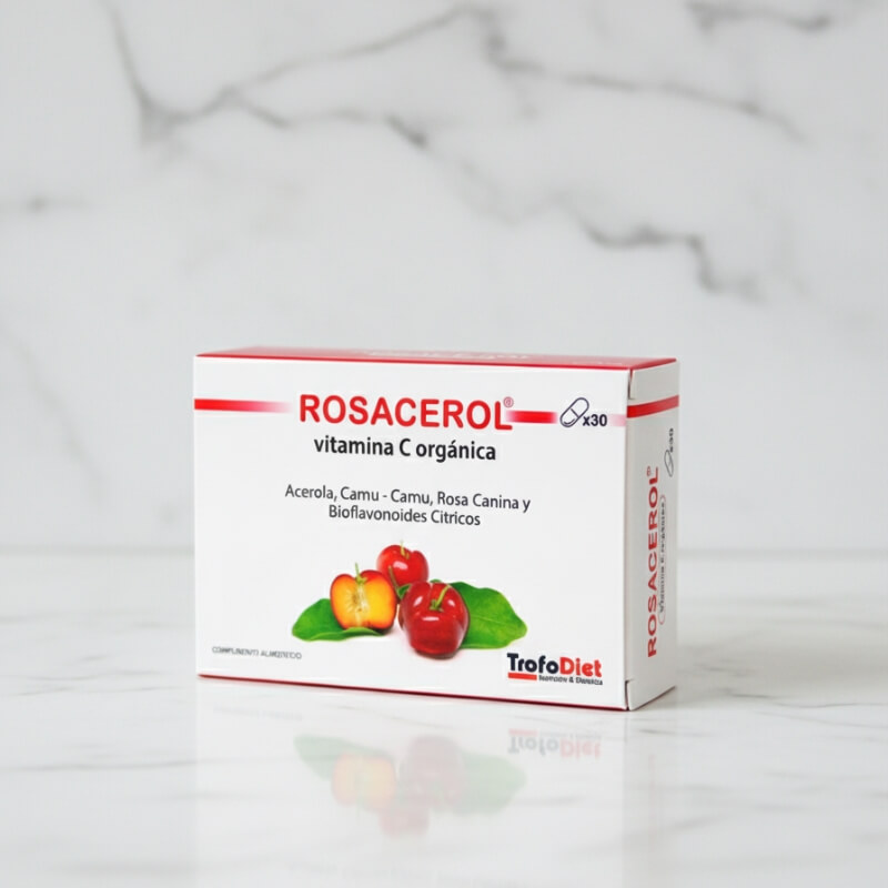 Rosacerol® es un complemento alimenticio diseñado para proporcionar una fuente natural de vitamina C orgánica, ideal para fortalecer las defensas del cuerpo, mejorar la salud de la piel y combatir los efectos del estrés oxidativo. Con ingredientes de alta calidad como Acerola, Camu-Camu, Rosa Canina y Bioflavonoides cítricos, esta fórmula te ofrece un potente antioxidante natural que apoya tu bienestar general y mejora tu vitalidad.